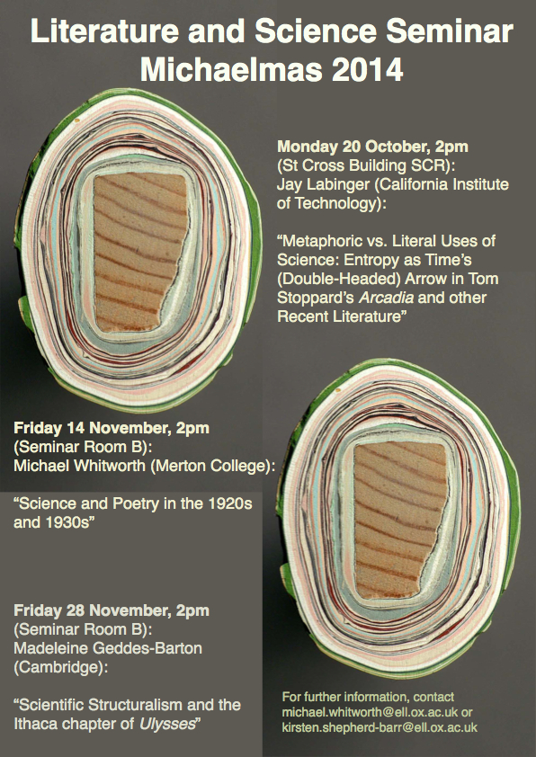 (Most people attending the symposium seemed to have very positive experiences, whereas I’ve had an M.St. special option that recruited only one person and wasn’t viable, and a series of lectures on Literature and Science that dwindled to an audience of about two by its final week. With hindsight, I think the M.St. option was too narrowly drawn — science and poetry in the early C20th — while the lecture series had the bad luck to be timetabled against a very popular series on key concepts in literary theory.)