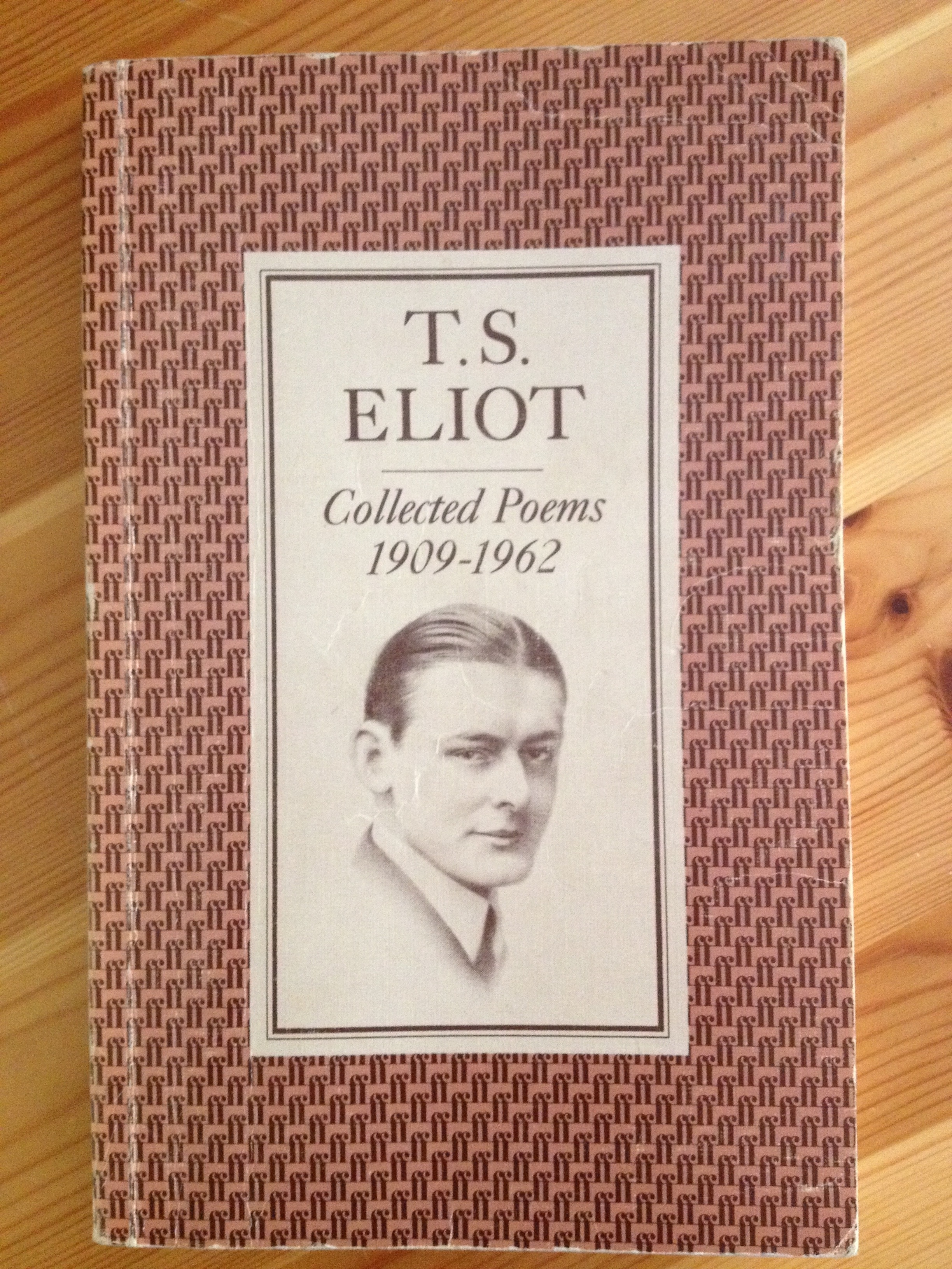 My guess is this must have been the spring of my O-level year. I can’t remember whether there were any other Eliot poems in the anthology, but somehow I must have found out more about him. At the point when I left secondary school I was signed up to do science A-levels at sixth-form college (Maths, Biology, Chemistry, Physics), with a vague plan of going on to do a medicine degree; but over the summer I started to feel that I needed some expressive, artistic dimension to my studies, so after the O-level results came I phoned the sixth-form and swapped one of the science subjects for English Literature. At some point in September of that year, I bought Eliot’s Collected Poems; I wrote the date September 1984 in it, but nothing more precise. I remember distinctly buying it in Wallingford, a small market town ten miles from home where we didn’t shop very often; or rather, I remember beginning to read it in the car on the way home. Within a year I’d dropped another science subject, and set myself on studying English at University, now with the unusual subject combination of Chemistry, Maths, and English.