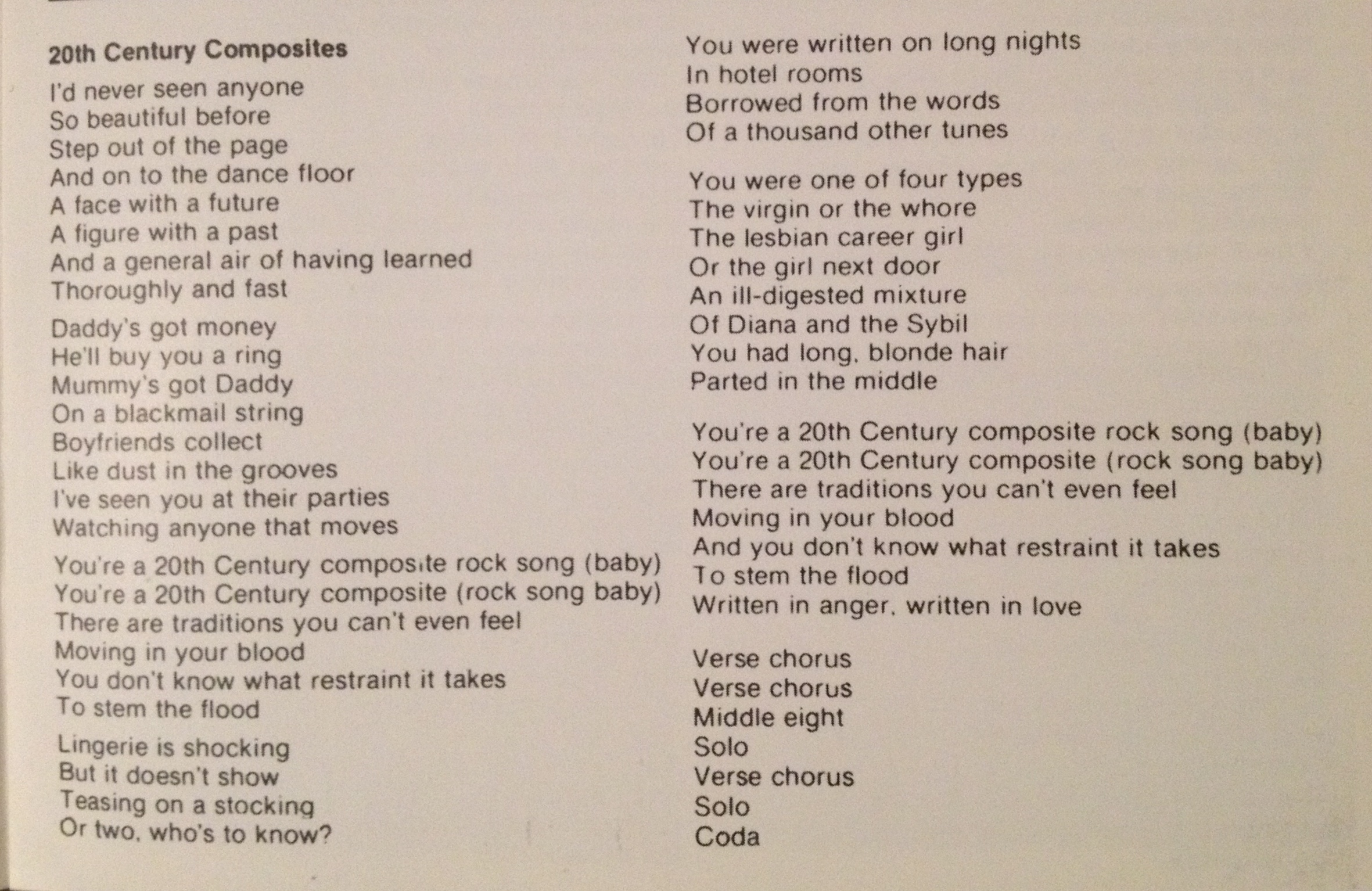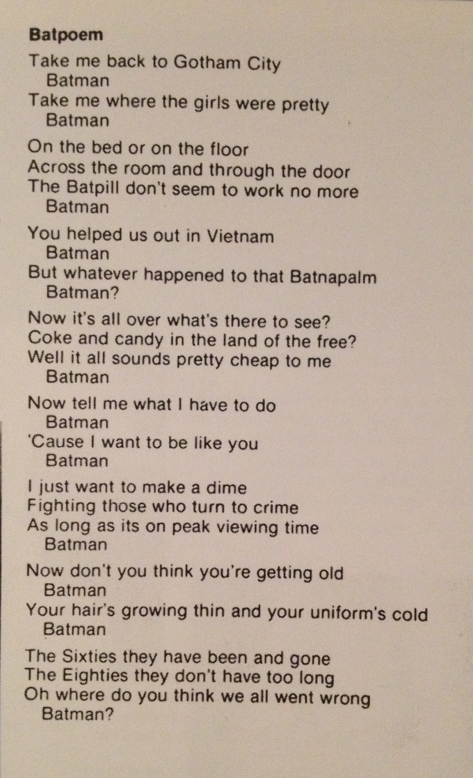 There are two versions of this song, significantly different in pace, one on Bop Art (1984), and the other collected on Friendloverplane (1988). I heard the Friendloverplane version first and still vastly prefer it: it goes at a much higher tempo, and Gerard’s vocal performance feels more confident and committed. If there’s a slight loss it’s that the bass gets somewhat buried in the mix, but it can have its effect even when the listener isn’t particularly conscious of it; it’s a very busy bassline, especially at the faster tempo. In the Bop Art version the bass has a fatter, softer sound, and is more prominent. The Bop Art drums have a crude echo on them that makes them sound like a weird kind of rockabilly.